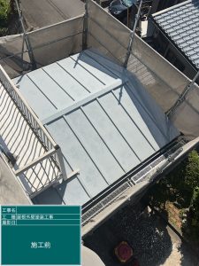 ルーフィングシートは田島ルーフィングのPカラーEX+という改質アスファルトルーフィングを使用しました。こちらは通常のルーフィングシートよりも耐久性が高く、耐用年数も通常のものの約2倍といわれています。