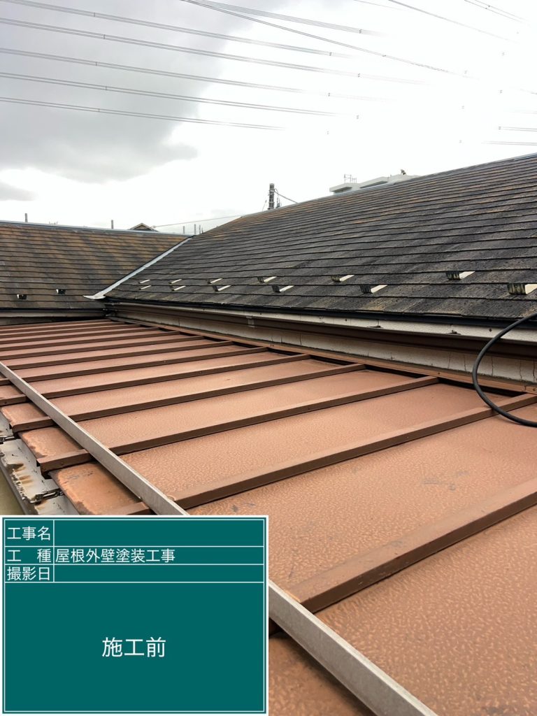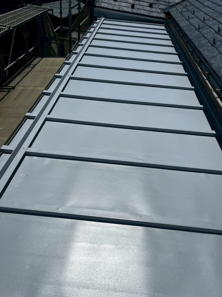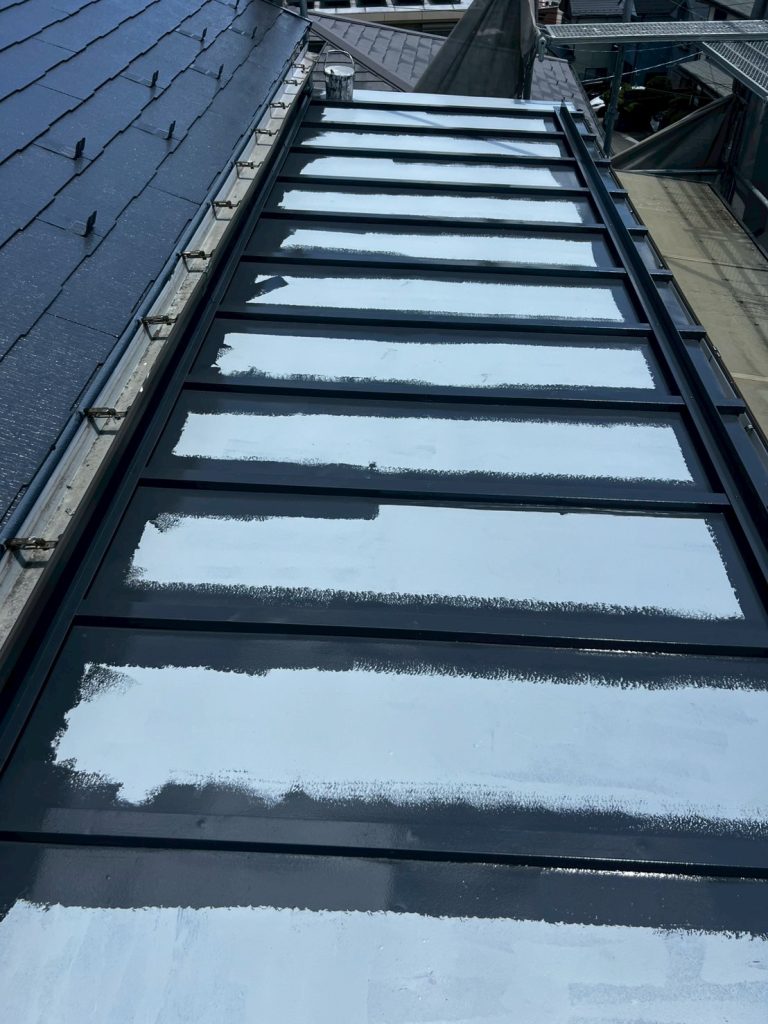 大屋根よりも低い位置にあるのが下屋根です。大屋根とは別の素材の屋根を使用していますが、塗装の工程はほとんど同じになります。