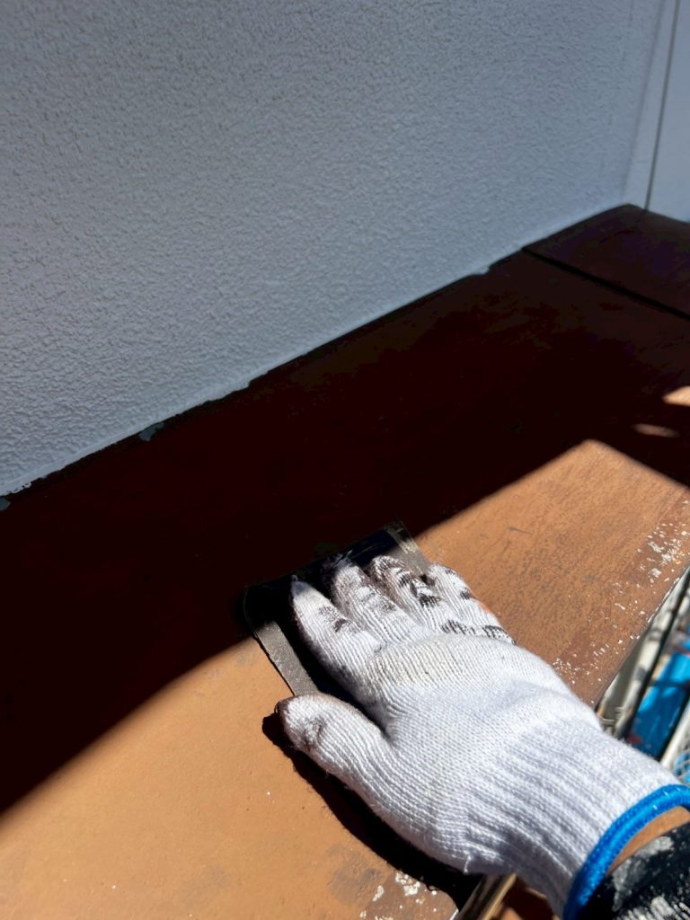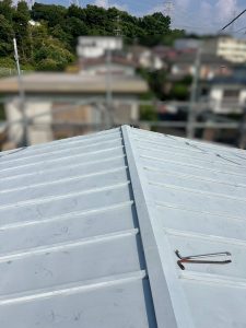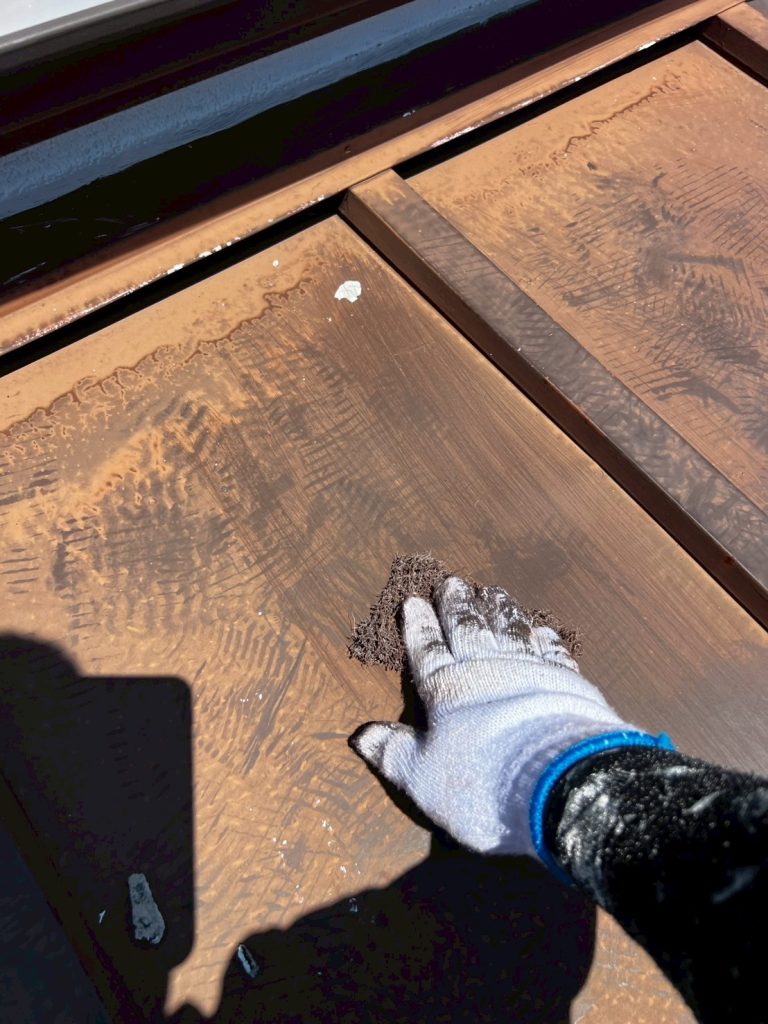金属屋根のため、サビをサンドペーパーやワイヤーブラシ等を使って手作業で削り落とします。同時に、塗料の密着性を高めるために表面に微細な傷をつける「目荒らし」も行います。そして、高圧洗浄でも古い塗膜や汚れをしっかり落としていきます。