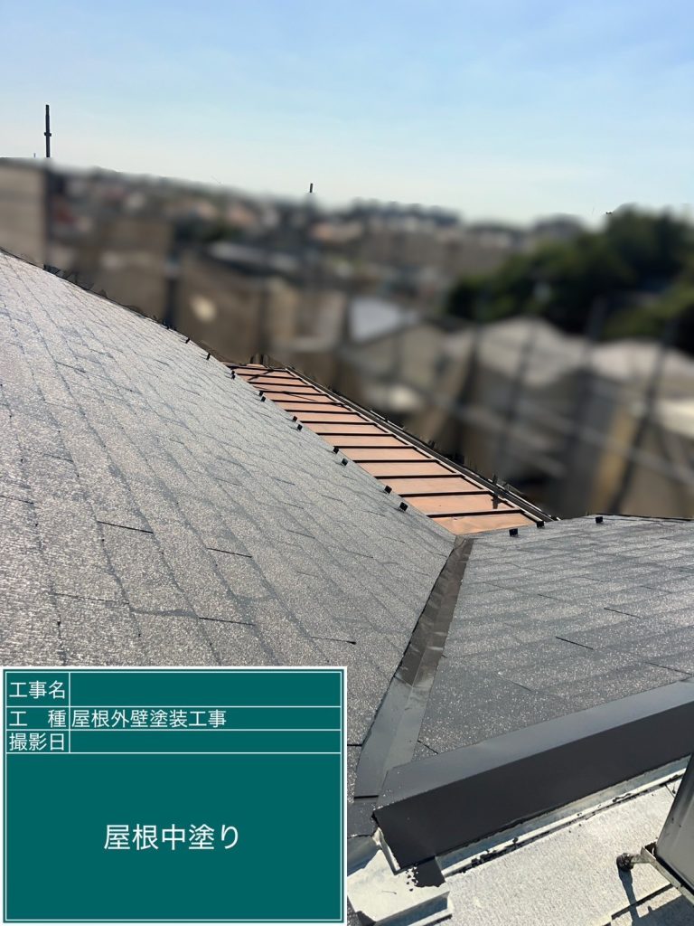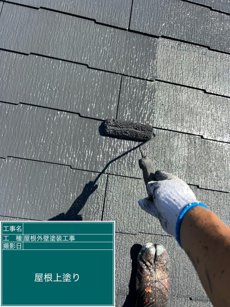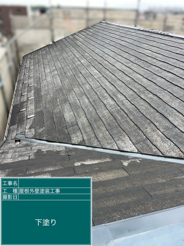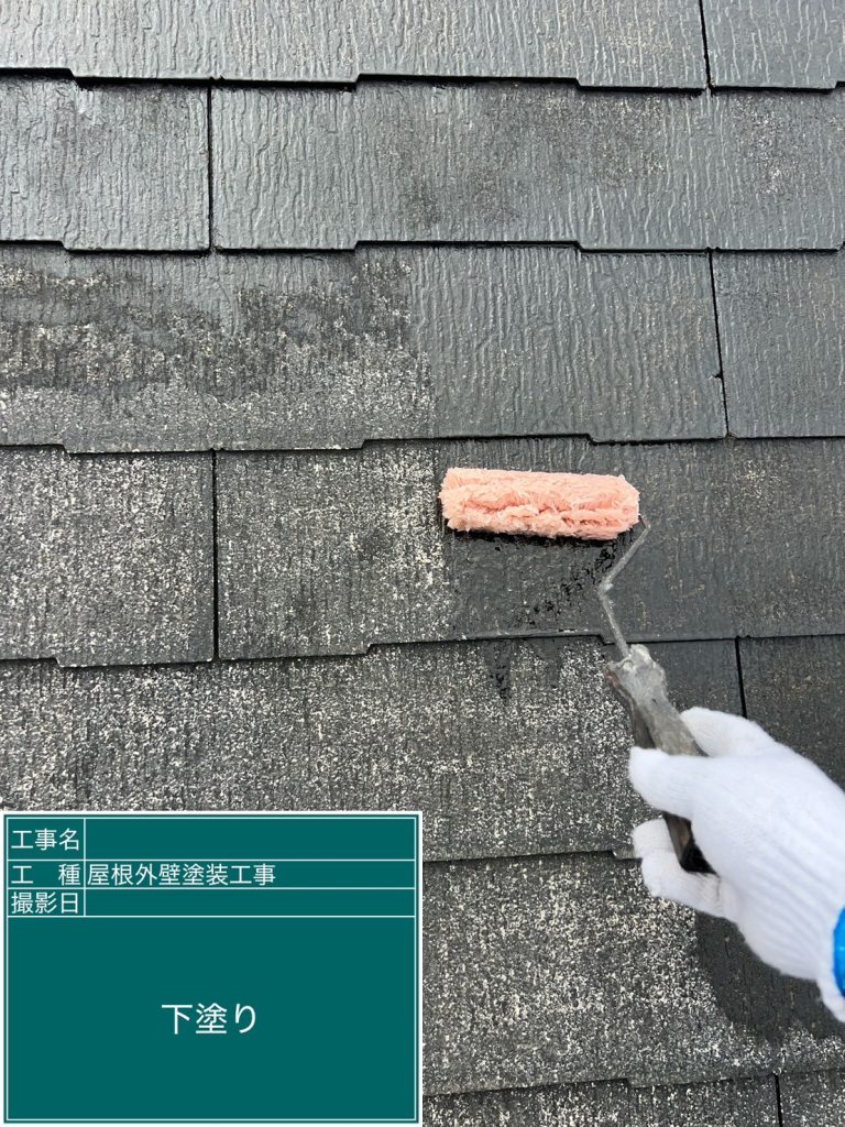 乾燥した後、下地強化下塗り剤で下塗りを行います。下塗りは屋根材の細かい傷等を補修して下地を強化し、屋根材と仕上げ用塗料との密着性を高める接着剤のような役割があります。