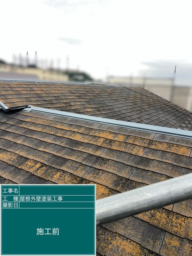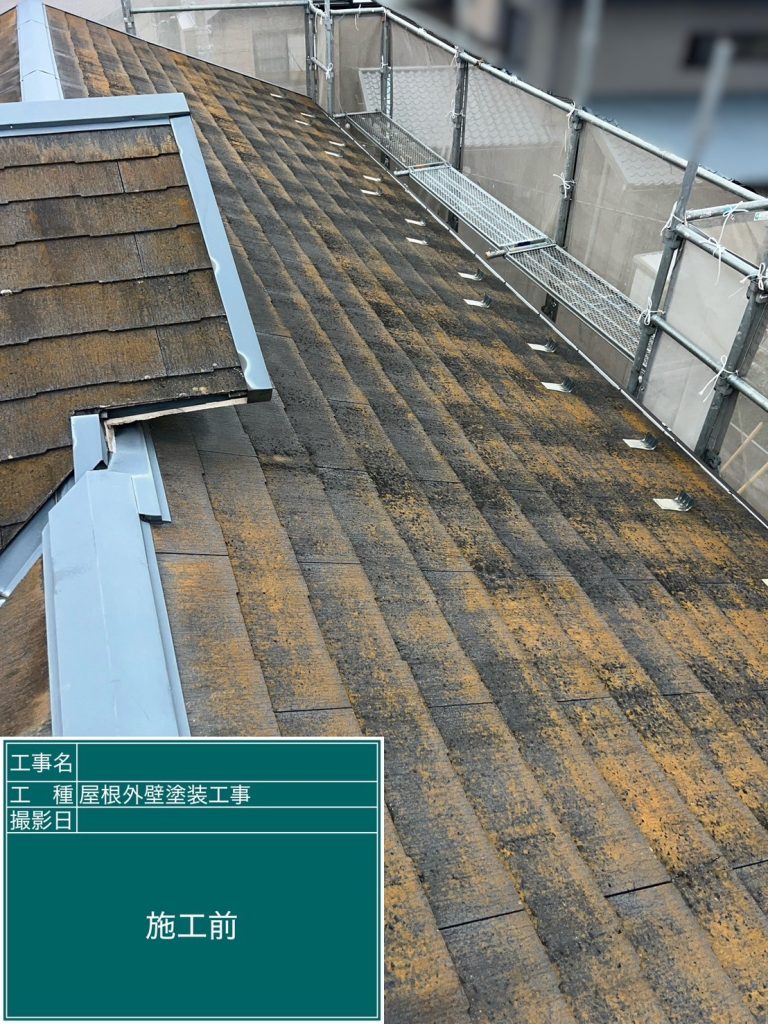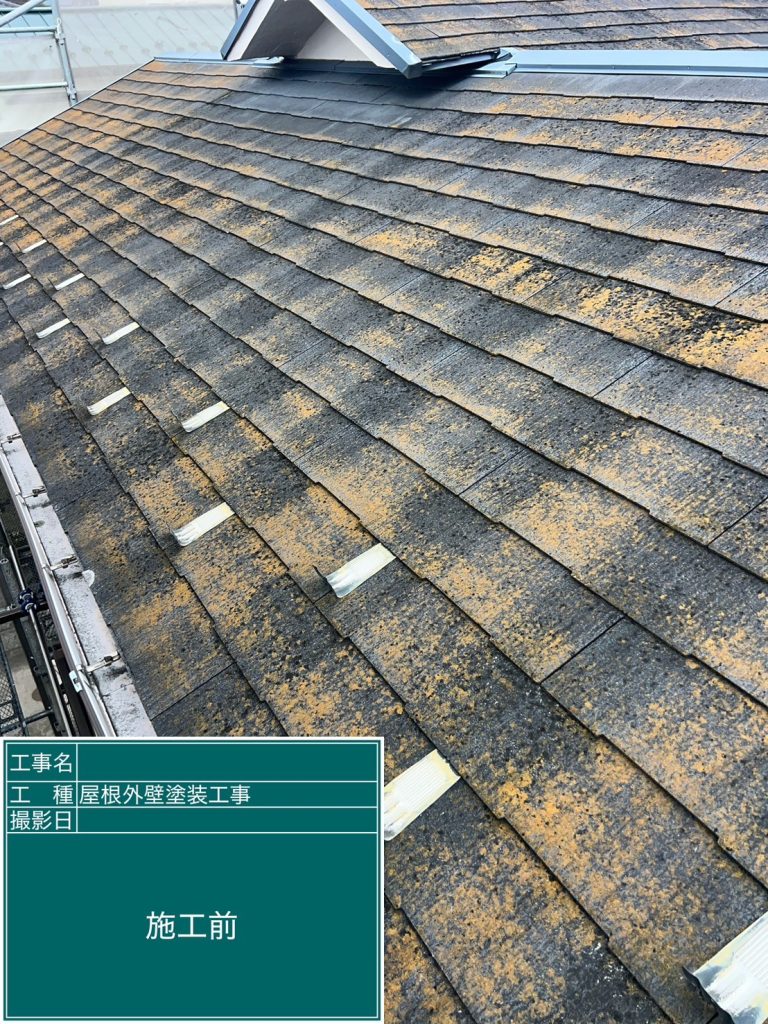 お客様のスレート屋根にはコケや色褪せが目立っていました。この状態になってくると、防水性や耐水性が徐々に落ちてきてしまうため、屋根塗装を行い、防水性を確保していきます。