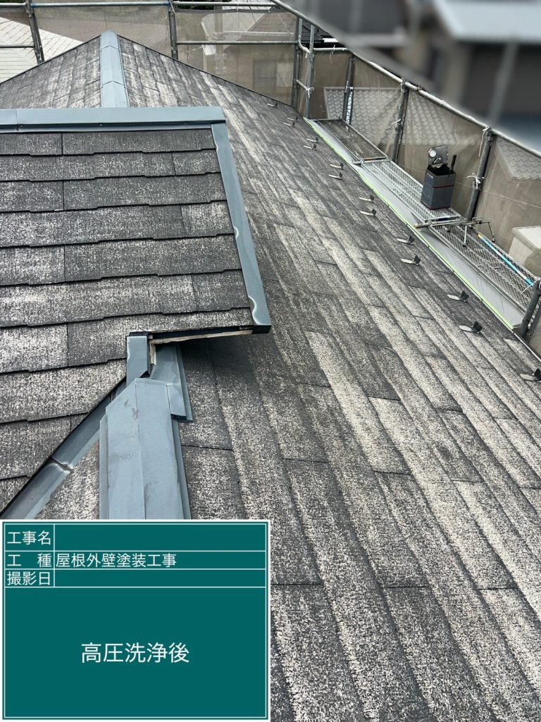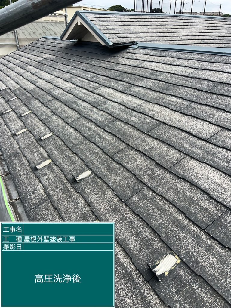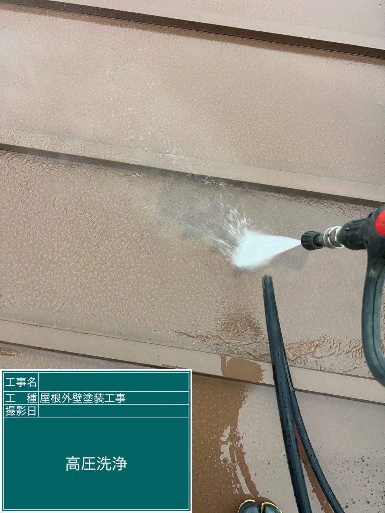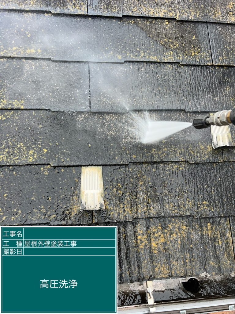 まずは、塗装の前に古い塗膜や付着している汚れ等を高圧洗浄機で落としていきます。高圧洗浄を行わないで塗装すると、屋根材と塗料との間に古い塗膜や汚れ等が挟まり、しっかりと密着されずすぐに剥がれ落ちる原因となり、新しく塗った塗料が長持ちされません。そのため、高圧洗浄はとても大事な工程になります。