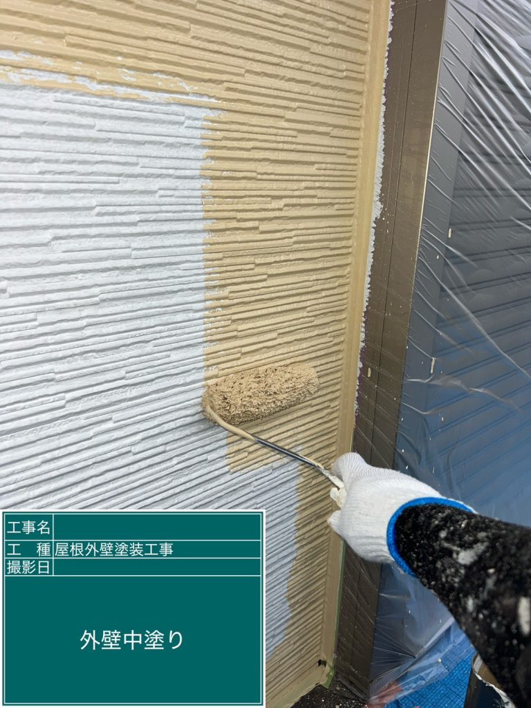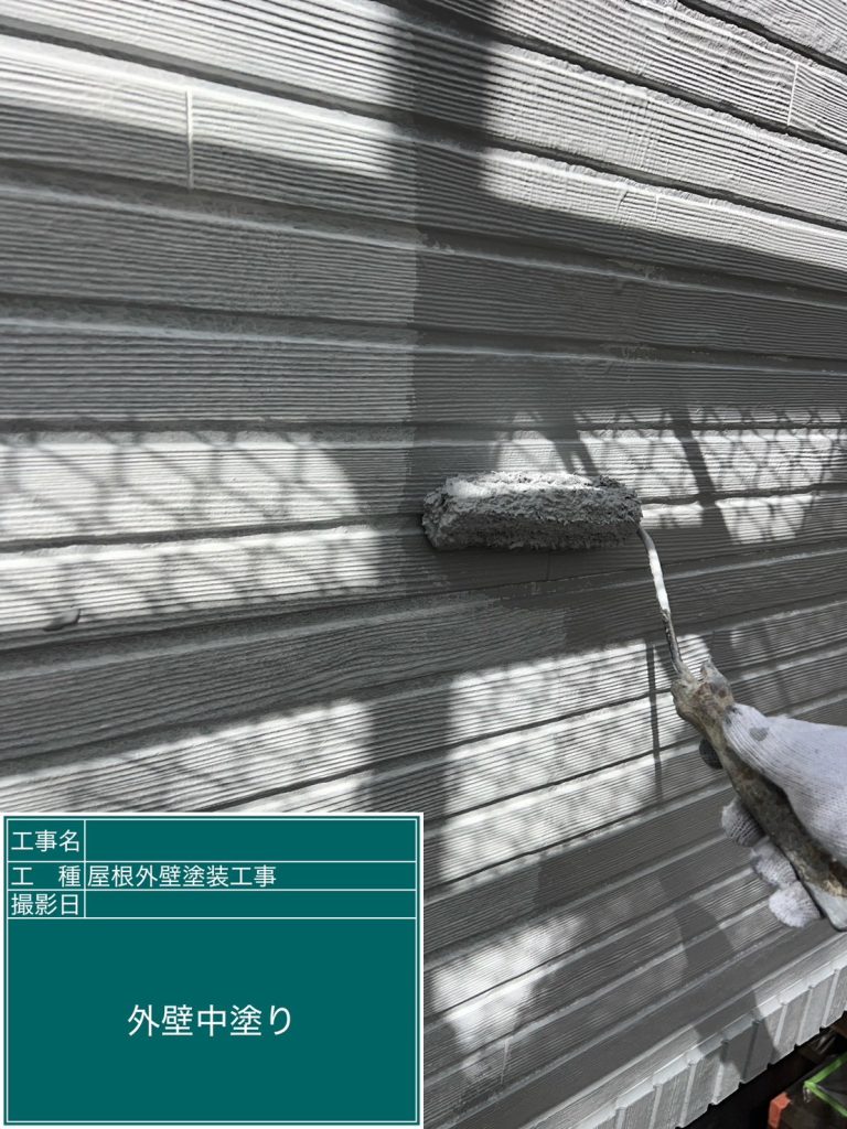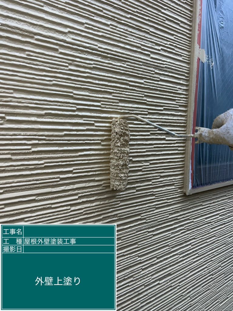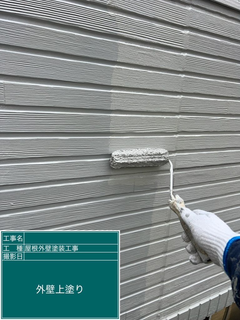 上塗りでは中塗りと同じ塗料を使用します。一度の塗装では色の出方にムラができてしまったり、塗料で指定されている厚みを作り出すことが難しいです。そのため、上塗りで同じ塗料を重ねて塗装することで、発色も安定し、規定の塗膜の厚みができると耐候性や遮熱性等の塗料の持つ機能が十分に発揮されます。