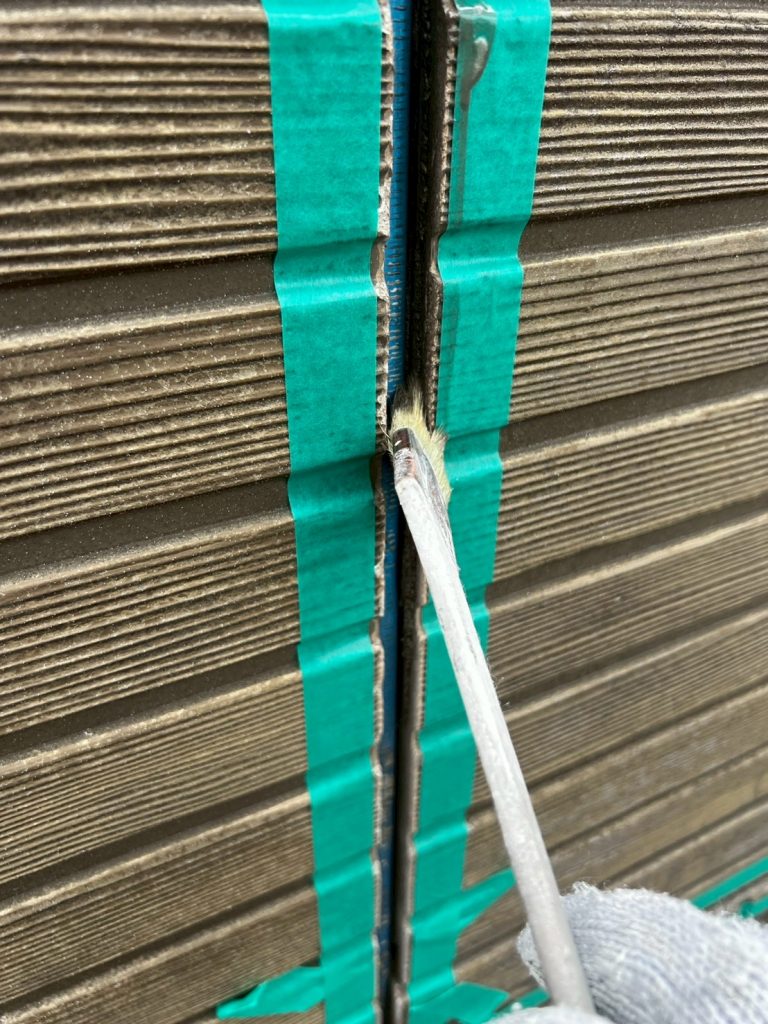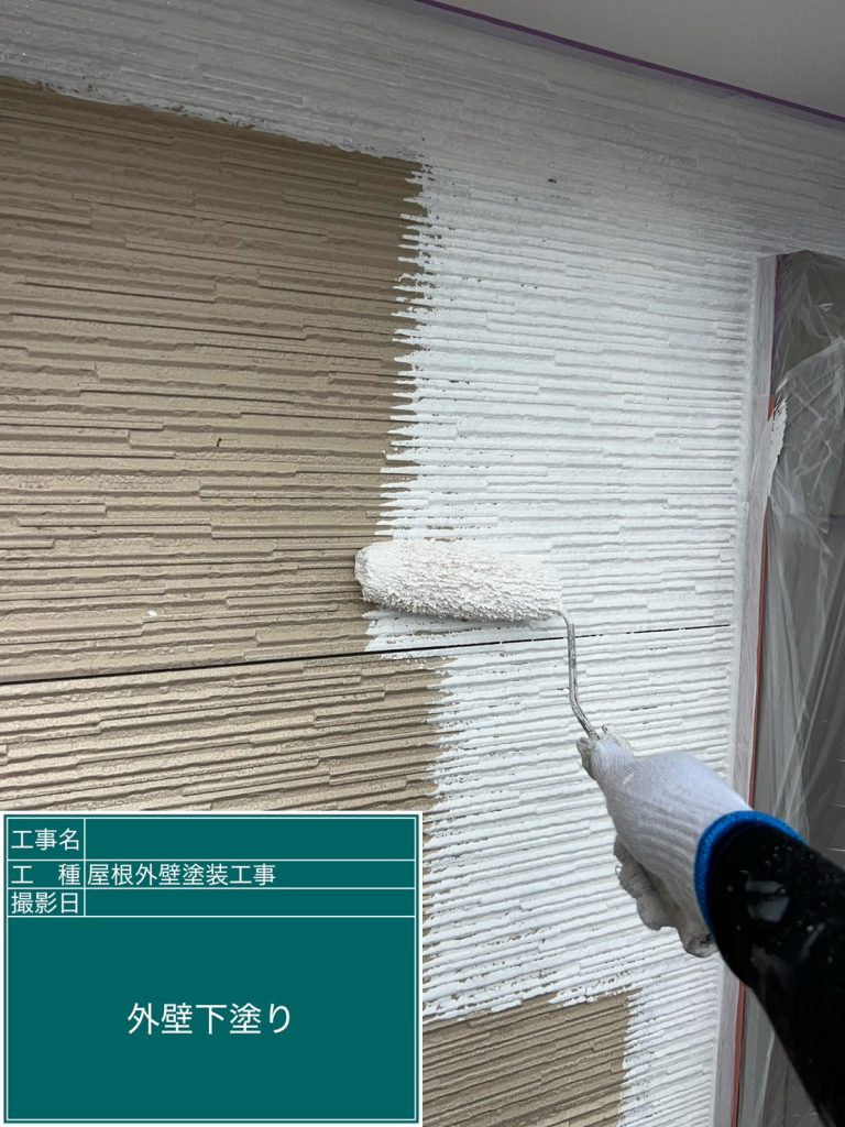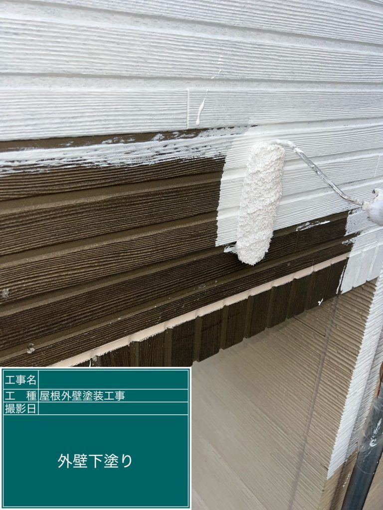 乾燥後に下塗り専用の下地強化剤を使用し、下塗りを行いました。下塗りをすることで外壁下地と仕上げ用塗料の密着性がより強固になり、剥がれの防止になります。
