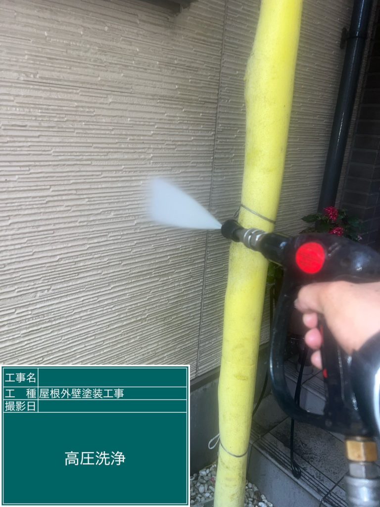 塗装工程です。塗装前に高圧洗浄機で壁の汚れや古い塗装の膜等を落とします。