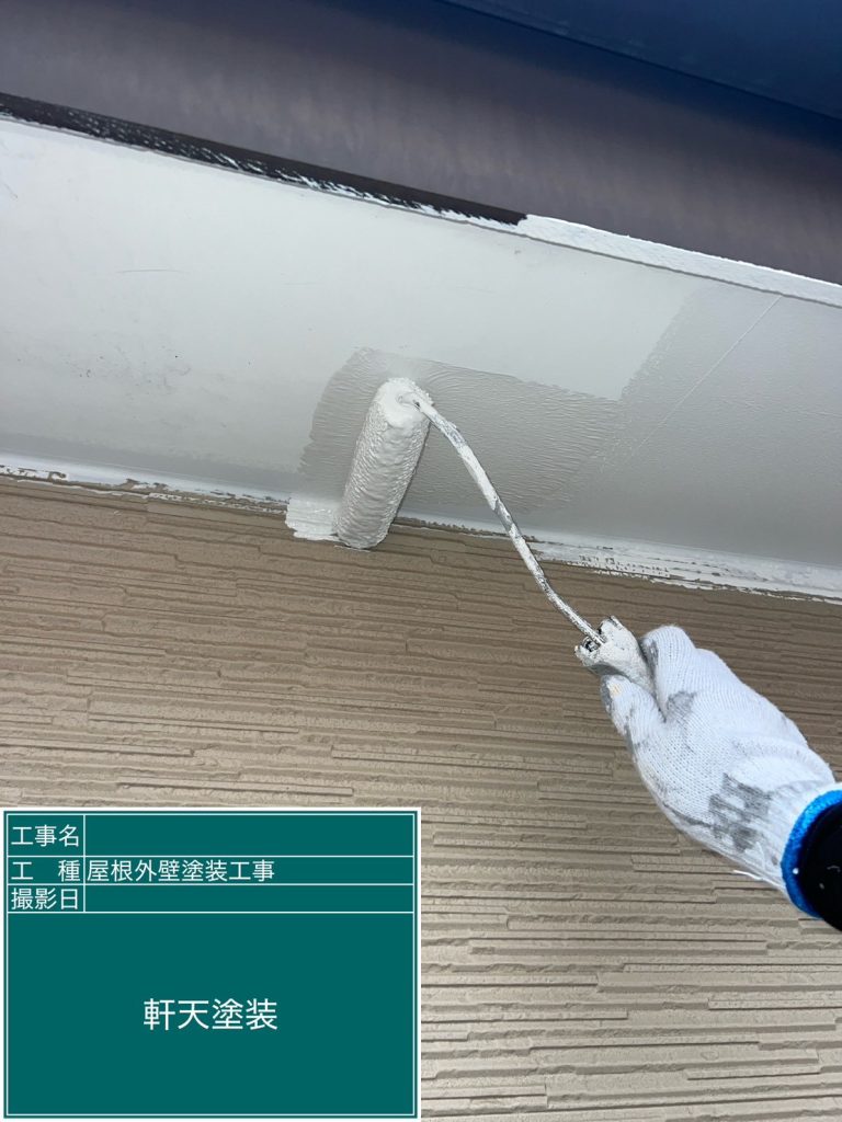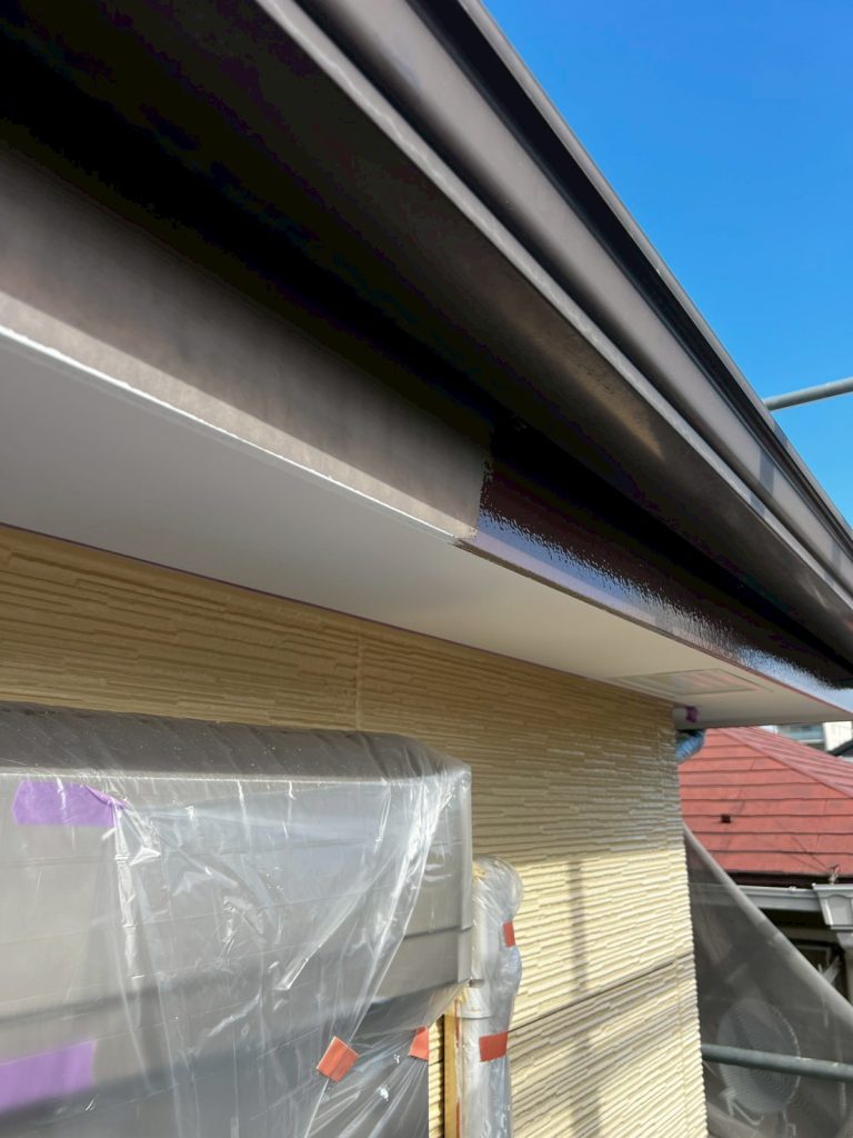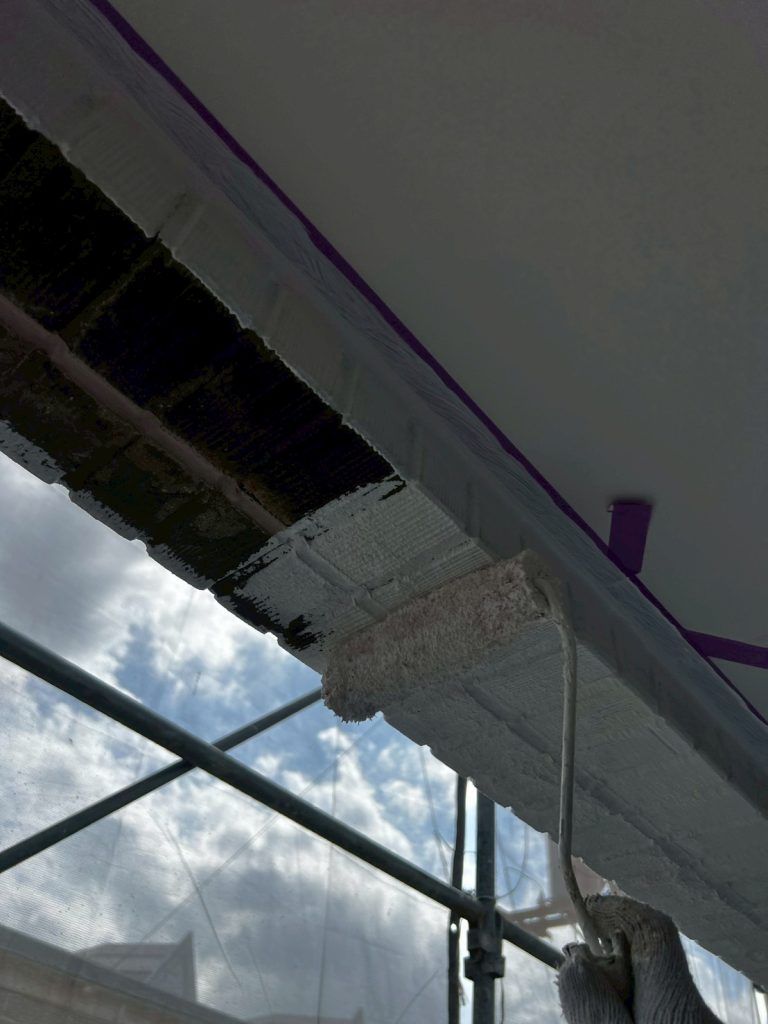 軒天と破風の塗装も外壁塗装と同様の工程で塗装を行います。下塗りは強化下塗り材を使用し、上塗りはウレタン塗料の中で耐久性が高い日本ペイントのファインウレタン100を使用しました。