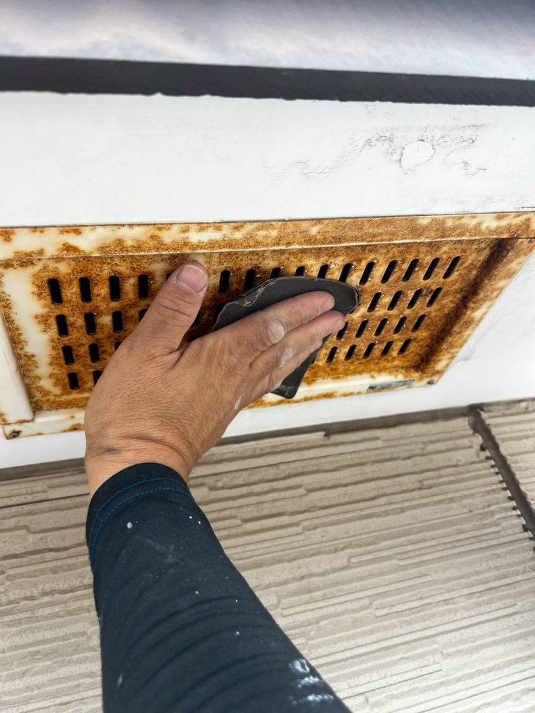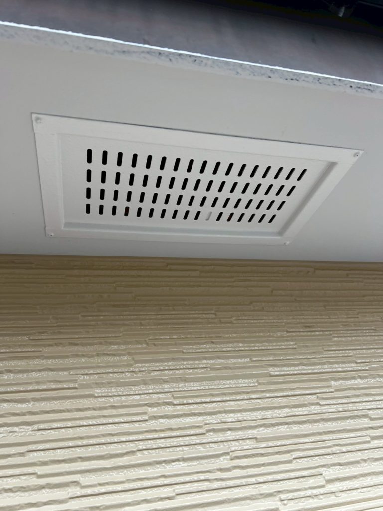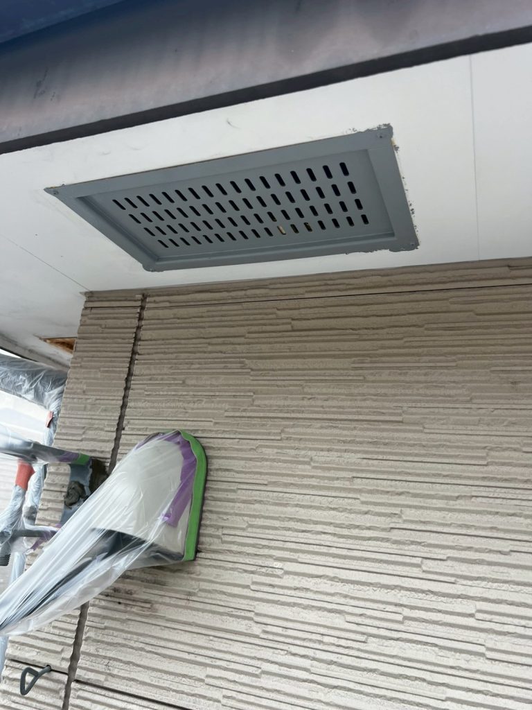 軒天に設置された換気口が錆びていたため、こちらも塗装します。ケレンで酸化物を除去し、錆止めを塗ります。そして、シーラー、中塗り、上塗りを行いキレイになりました。