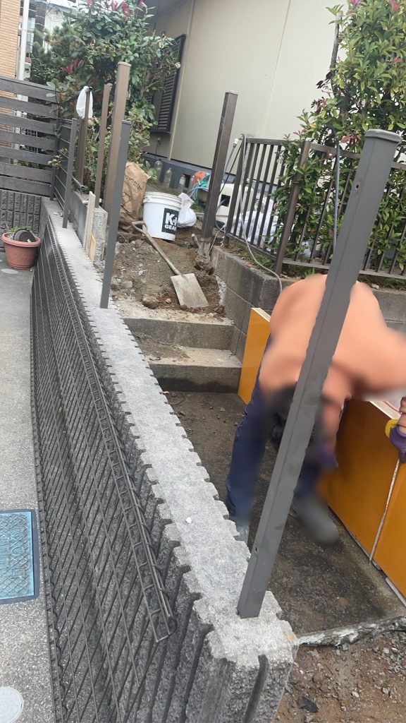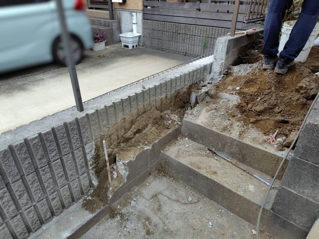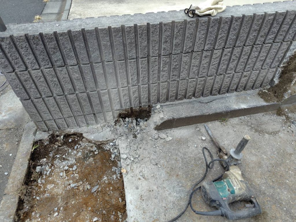 まずは、手すりを設置すると道の幅が狭くなってしまうため既存の塀を解体し、既存の土間コンクリート(地面)も切断して撤去します。