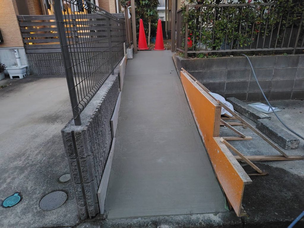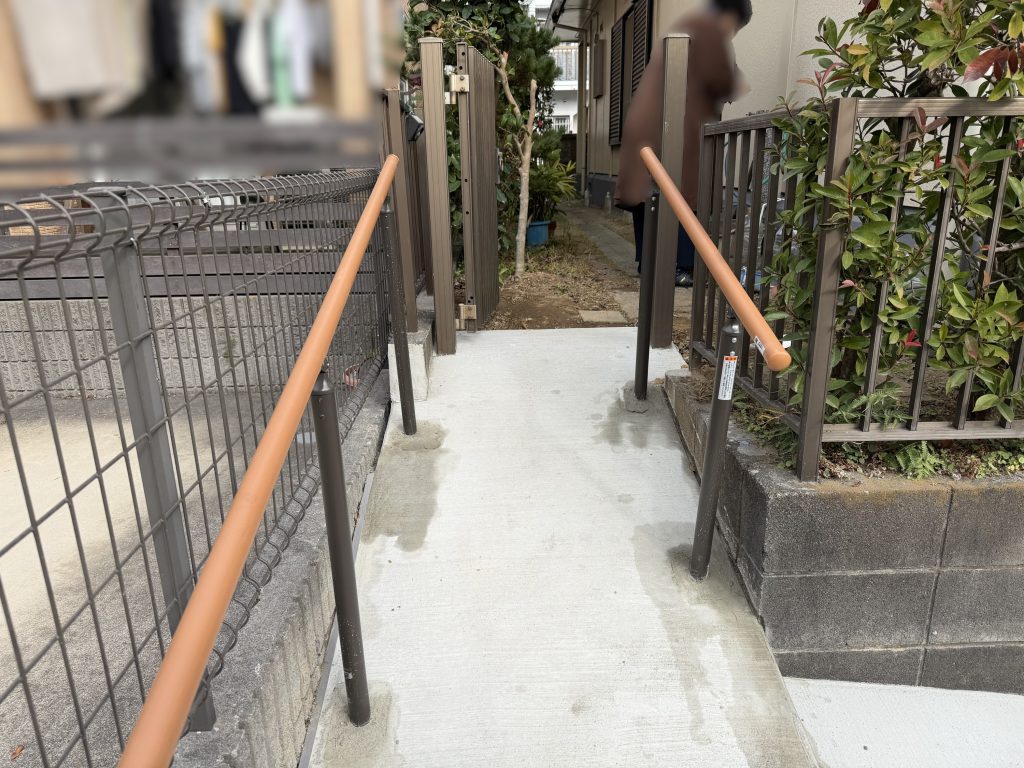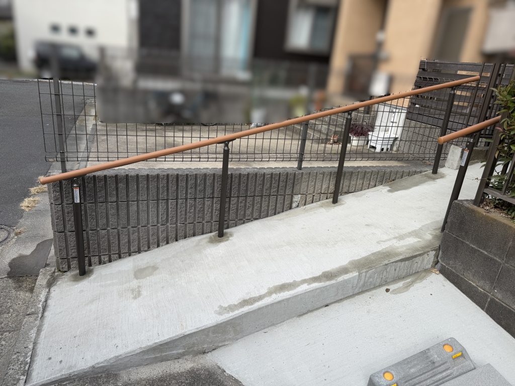 今回は、玄関から道路までの通路の階段をスロープ化にして、両端に手すりを取り付ける工事を行いました。